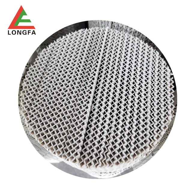 陶瓷規整填料是一種在培內以均勻幾何圖形排布,整齊堆砌的培填料。規整填料主要是取代塔內散堆填料,解決阻力大、比表面積小,傳質效能差、易破碎等突出問題。它規定了氣液流路.改善了淘流、壁流和潤濕性能.降低了阻力,同時提供更多的氣液接觸面積從而提高了傳質,傳熱效果。可廣泛用于煤氣洗滌塔.焦化洗滌,洗苯、洗氨培、化肥熱氣飽和、脫硫酸、硫酸干燥、吸收塔等。陶瓷波紋規整填料是用硬質瓷構成,主要成分粘土、石英、長石等經特殊烘燒而成。其形成是由許多具有相同幾何形狀的單元體波紋片相互平行,叉疊加組成。